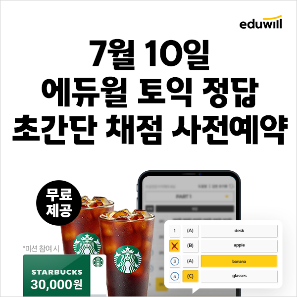 에듀윌 토익 관계자는 "토익 시험은 시험지를 가지고 올 수 없어 시험 직후에 점수를 확인하기 어렵다”며 “에듀윌 토익 정답 초간단 채점 서비스를 통해 정답과 정답 키워드를 통해 시험 직후에 점수를 바로 확인해보길 바란다"고 전했다.