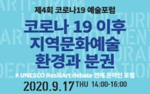 문체부는 지난 7월부터 예술 분야 기관 7곳과 함께 ‘코로나19 예술포럼’을 12월까지 총 7회 연속으로 개최하고 있다. 이 토론회는 유네스코가 제안한 ‘예술의 회복력 운동’(리질리아트 무브먼트, ResiliArt movement)과도 연계해 진행한다.