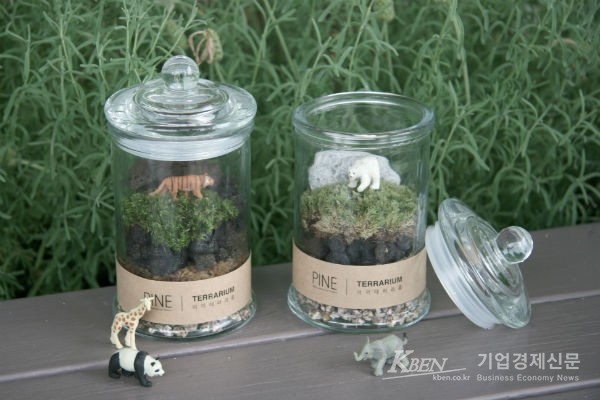테라리움은 비단 이끼를 사용하였다. 비단 이끼는 이끼류 중에서 가장 많은 수분을 머금는다. 좁은 공간 안에서 가습기 역할을 하며, 물을 한 달 주기로 갈아주면 되어 많이 손이 가지 않는다. 또한, 뚜껑을 닫아 높으면 자정작용을 함으로써, 반영구적으로 썩지 않는다. 사무실같이 건조한 곳에서는 7일~15일 정도 주기로 분무기로 물을 분사해주면서 이용하면 된다. 물을 주지 않는다고 해서 이끼는 바로 죽지 않는다. 수분이 날아가면 저절로 휴면상태로 돌아가기 때문에, (주)피네 식구들끼리는 “이끼를 죽이면 그 어떠한 것도 못 키워요. 동물이든, 식물이든....”이라는 말이 나올 정도이다.